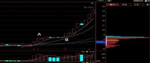 1、主力在A点前的区域沿中短期的5、10日线布局,呈小步上扬的形态。