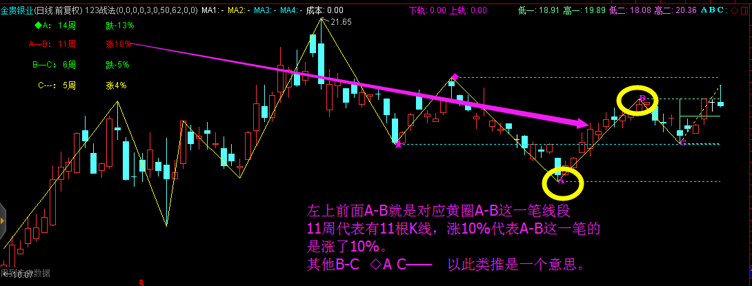 2、黄色实线:波段高低点连线-----便于观察K线的形态结构。