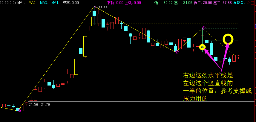 4、半分位:最近一段涨跌幅的相应价格向右画浅绿实线【0为段的最低价、50为段的中间价、100为段的最高价】----可以实战《黄金分割战法》的相关条件选股。