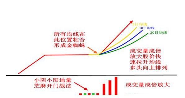 2. 三条价格平均线是指5日、10日、20日均线,三条均线在同一天汇聚在一点,发散向上,形态神似向上伸开的三条蜘蛛脚。