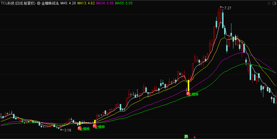 2、案例二:TCL集团(000100)该股在季量托的支持下走出了一阳上穿金蜘蛛的走势,股价放量突破金蜘蛛上平台应跟进。在金蜘蛛出现后应逢低买入,及时抄底,抓住的是大涨。