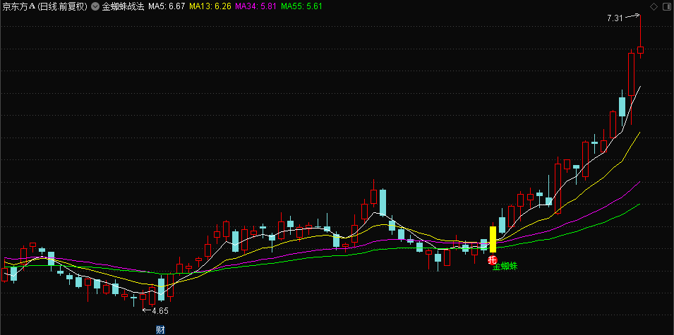 3. 上述形态发生前,股价经历过一个平台横盘整理后,某天股价突然放量拉升,一阳定乾坤,三条均线被这一大阳线贯穿,金蜘蛛形态就此确立。