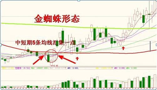 “金蜘蛛”买入法:是指从高位向下移动到低位后拐头向上汇合在一起的形态。由5日,10日,20日均线交叉于一点,然后股价站在交叉点之上的均线技术形态,标准的三线合一是比较少见的,俗称“金蜘蛛”。它要求至少有两条均线金叉,若是普通交叉或是死亡交叉那就够不成金蜘蛛。