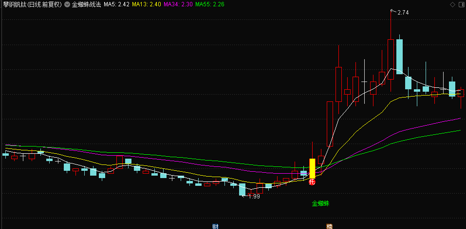 3、案例三:攀钢钒钛(000629)该股利用碰、撤、穿、压的走势攻克均线,5.10.20日均线金叉同时重合,系统而形成进蜘蛛,观察金蜘蛛钱已经形成,当是最佳的买点。