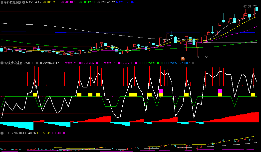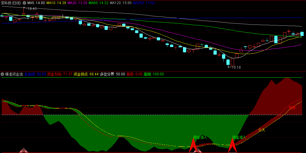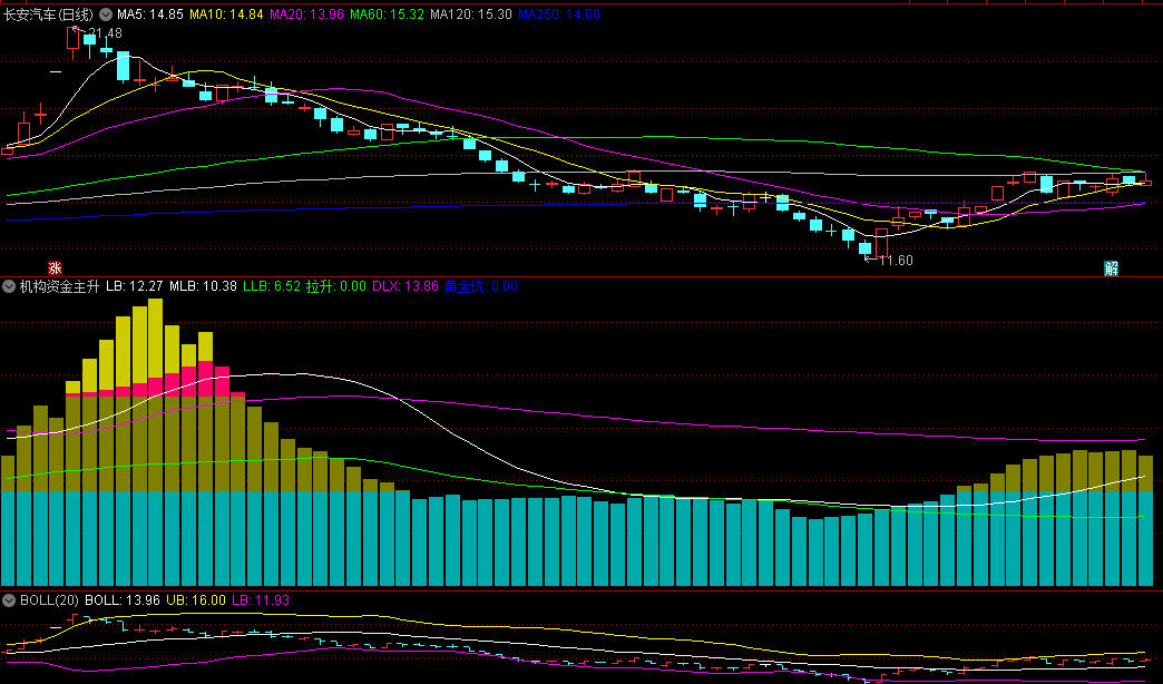 通达信【机构主力进场拉升】副图指标,当浅绿色机构进场信号与量价系统同步出现时,为较佳介入点一、主力动能系统1.双均线差值计算;2.信号处理白色柱状图:显示获利回吐区域,提示短期超买。浅绿色柱状图:标志机构主力进场建仓阶段。玫红色柱状图:警示...