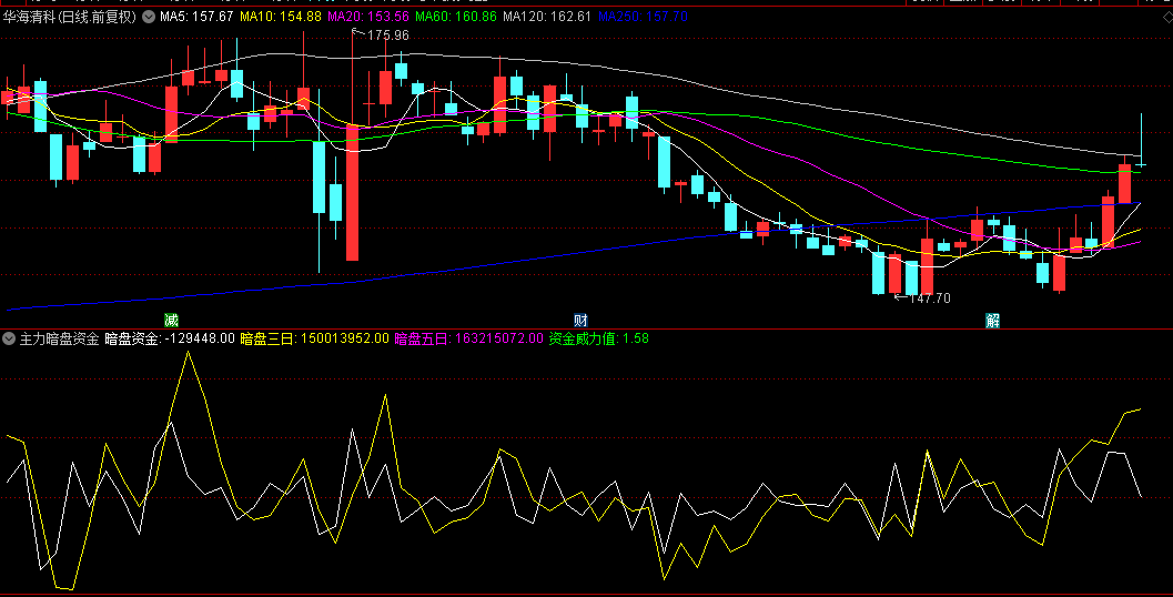 【主力暗盘资金威力】副图指标,当价格走势与红色资金柱同步上行,表明主力正在积极建仓