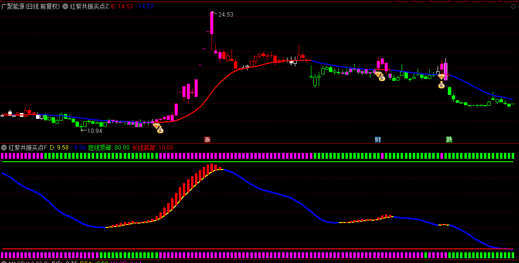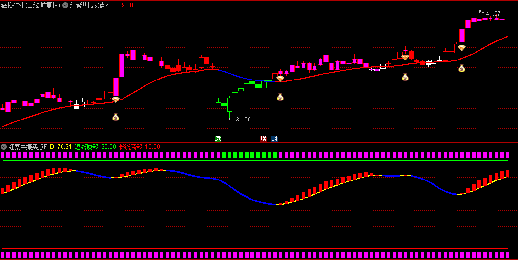 买入标记:首次出现多周期共振时,主图自动标注"钱袋"买入标识。