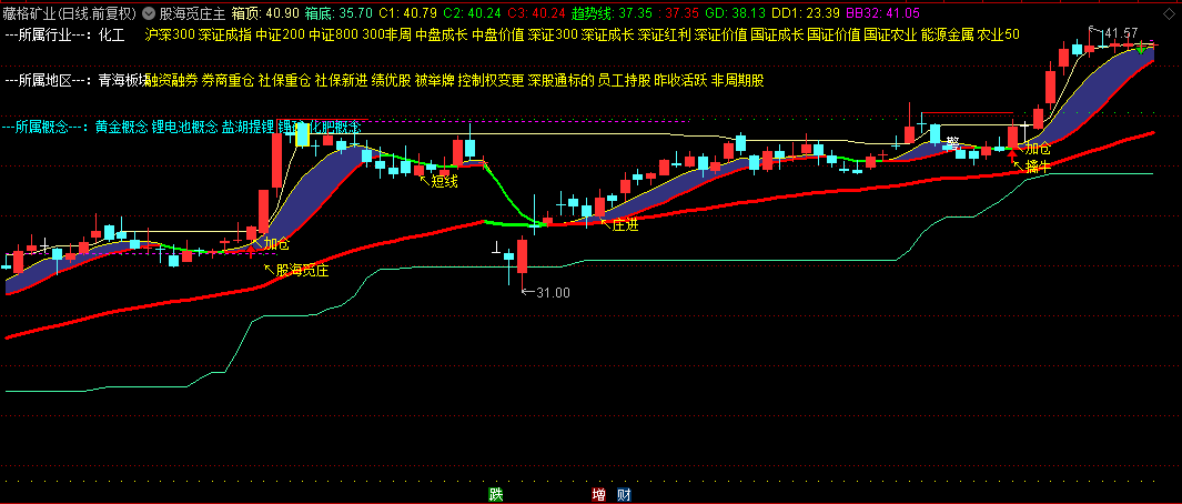 双线彩带(黄绿带)分开看涨,合一变绿看跌