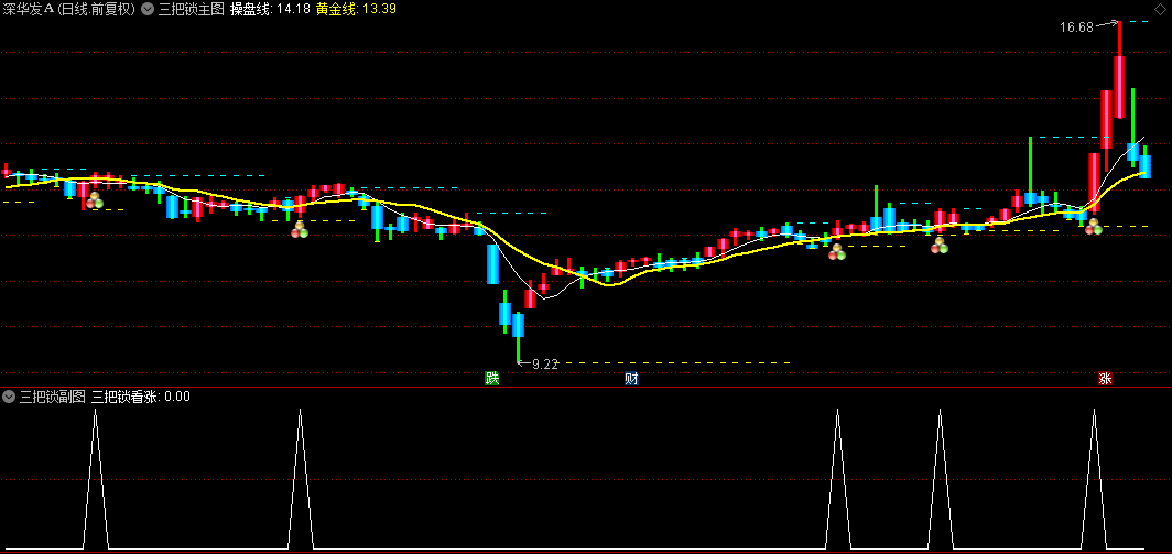 当价格运行于操盘线和黄金线之上时,系统显示红色K线,此时应保持持仓状态;