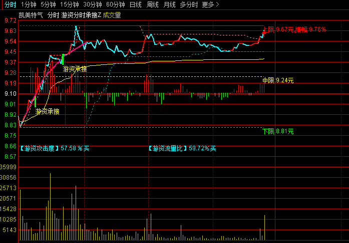 1.当游资攻击度>65且分时线站稳黄色成本线时,可参与首波拉升。