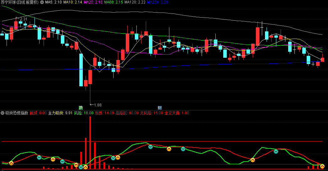 1.主力吸货量能柱(红色):采用38周期极值算法,智能识别低位恐慌盘;当红色量能柱显著放大时,表明主力正在低位承接恐慌抛盘;特别设置90周期底部确认机制,避免假信号干扰。
