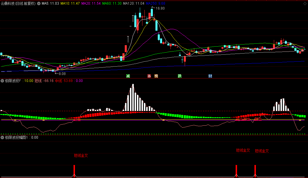 【极限波段】副图/选股指标,上穿越0轴的金叉信号,由弱转强买入时机判断!
