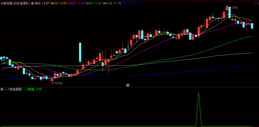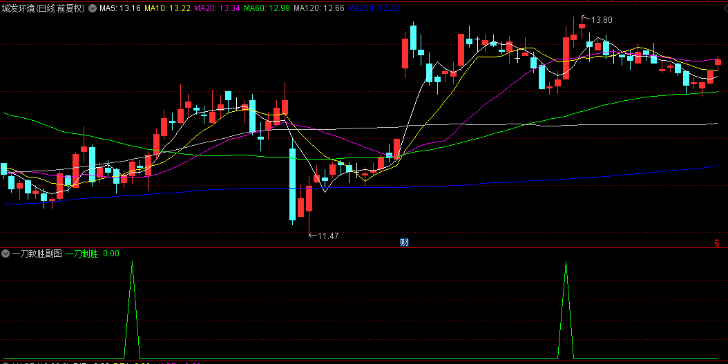 1.一刀致胜指标组合了多种技术分析方法,主要功能是识别趋势启动的买入信号,以10/20/60日均线的平均值,作为趋势中枢,顶线与底线构成价格通道,反映波动区间。