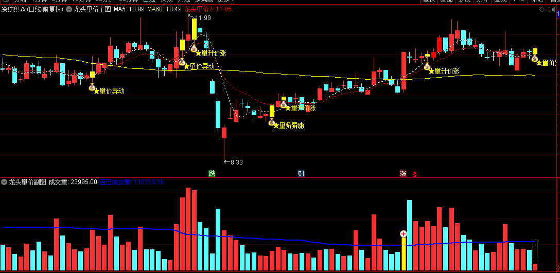 4.多维度信号组合:结合RSI、MACD等多种技术指标条件;黄色柱状图标记量价异动信号;添加"★量价异动"和"★量升价涨"文字提示。
