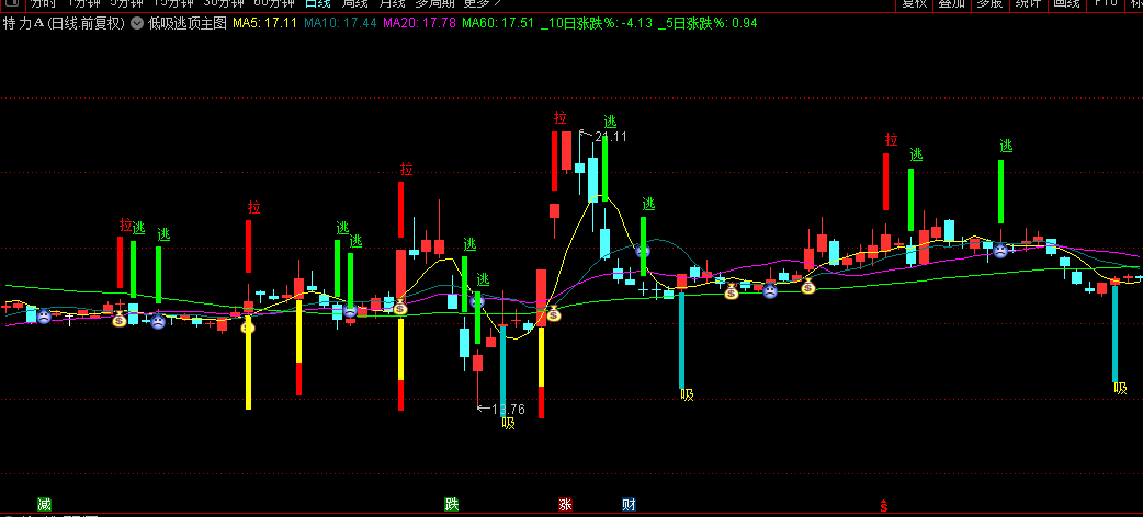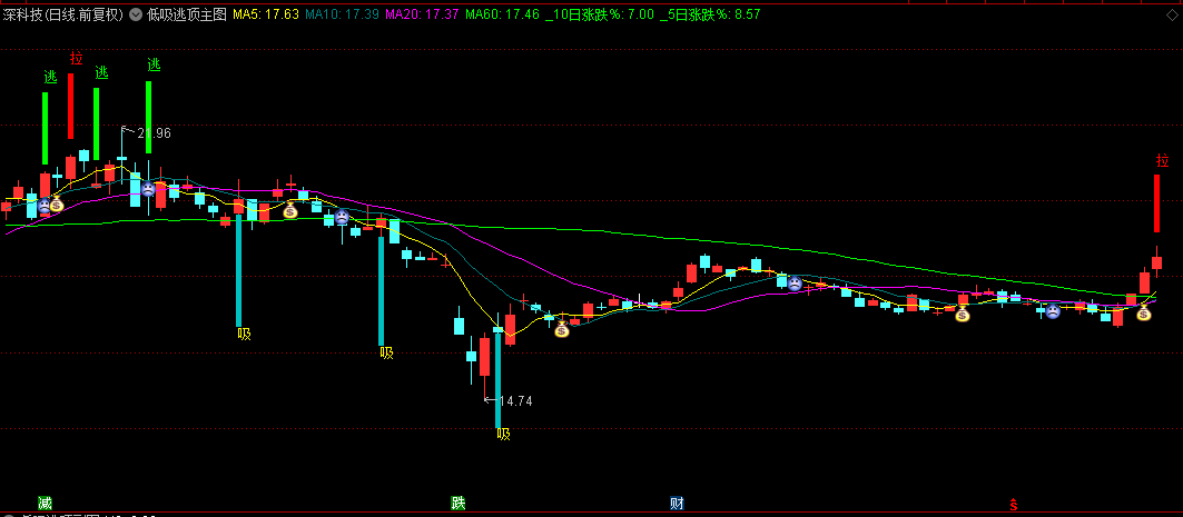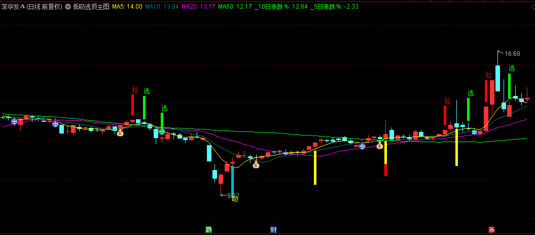 【低吸逃顶】主图指标,价格趋势+量能变化+情绪指,共振触发条件