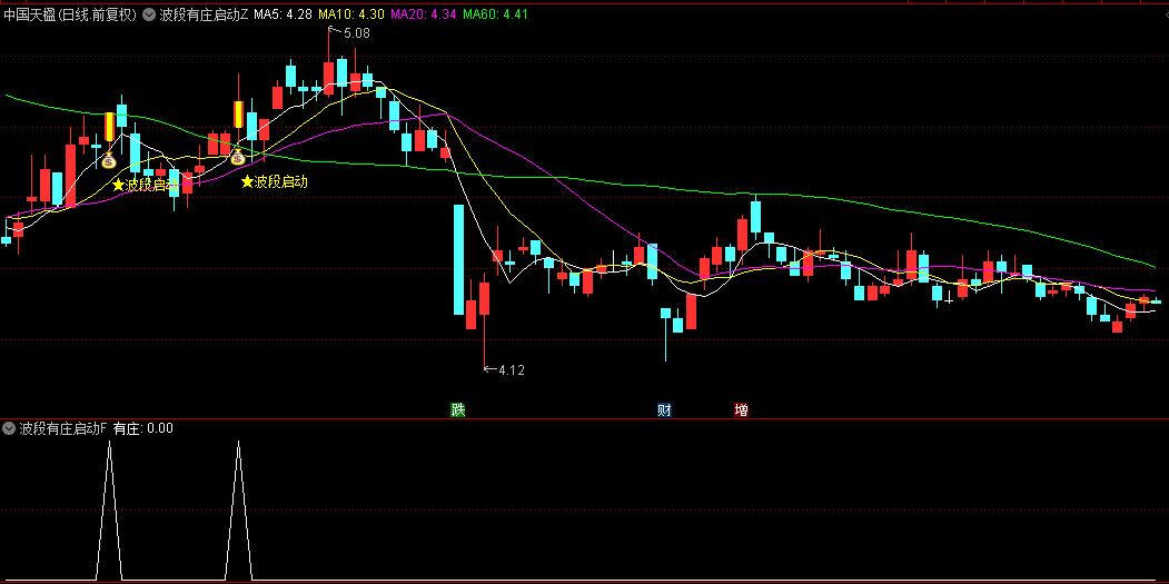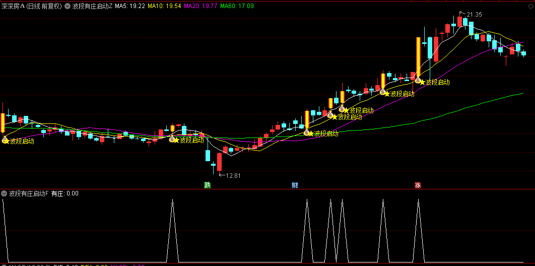 2.波段启动信号:当满足条件时,在K线下方显示黄色图标;将符合条件的K线用黄色实体显示;在K线下方标注"★波段启动"文字提示。