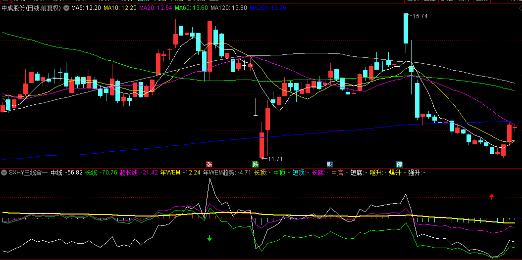 ②中底 (淡红↓ 60):中期趋势(长线)触及极端超卖并反转,长期趋势未确认但也不弱。提示中期反弹机会。