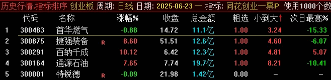同花一票:选股条件与副图"粗选"一致,筛选出开盘涨幅>3%、竞价换手率>0.8的创业板股票,且表现强于大盘。