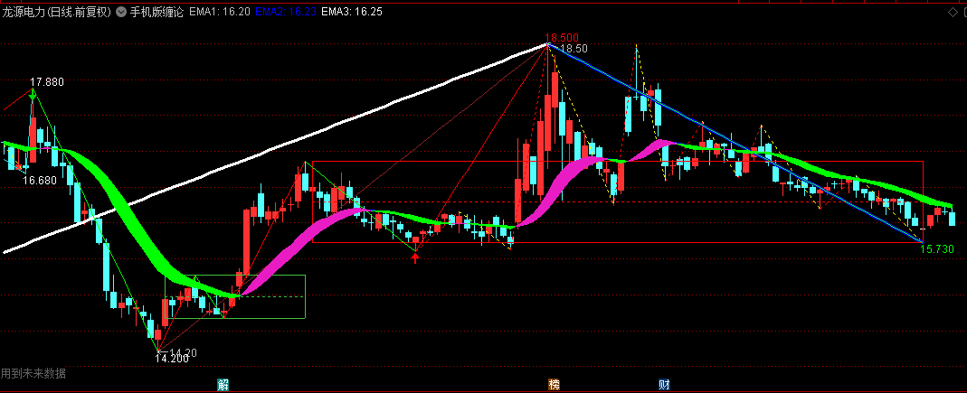 多级趋势研判:白色粗线标记上升趋势,蓝色粗线标记下降趋势,红绿中枢区间自动框选。
