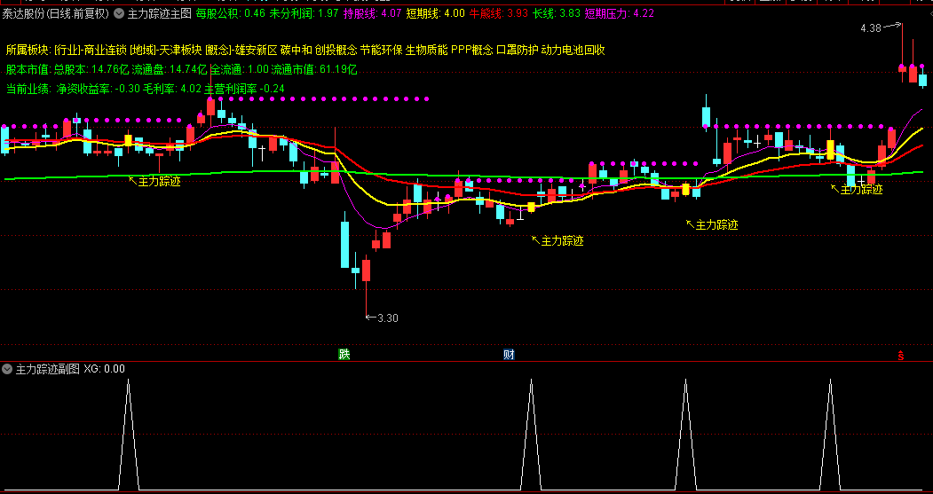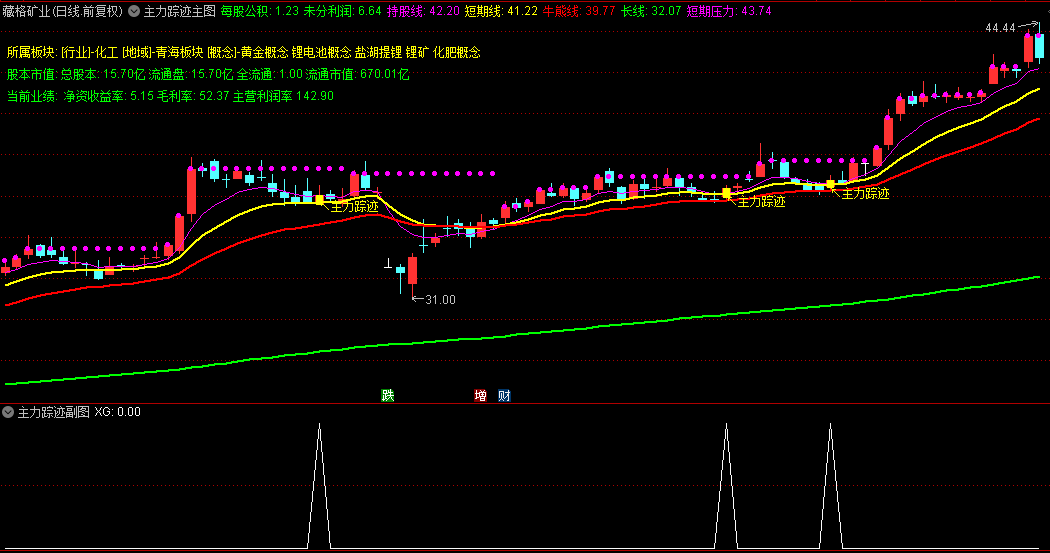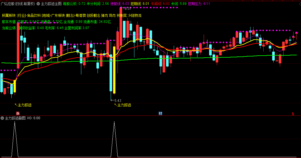 3.主力信号提示:当出现主力资金介入信号时,图表会显示"↖主力踪迹"标记并伴随黄色K线突出显示