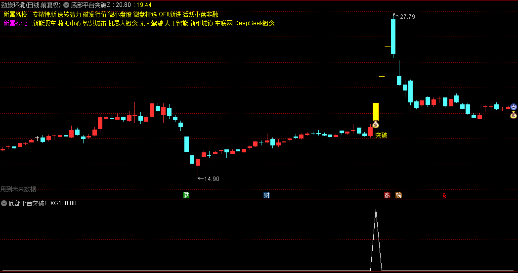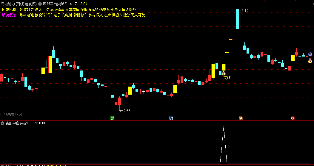 4.突破信号提示:当股价突破底部平台时,在低点位置标注"突破"文字提示;结合KDJ指标和均线角度过滤虚假信号。