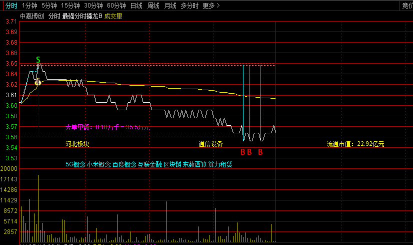 分时擒龙线(青色虚线):动态追踪当日股价最高点。