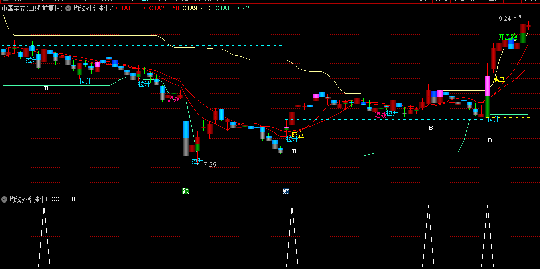 ③信号确认:系统生成"拉升"白色标记与"成立"黄色标识。