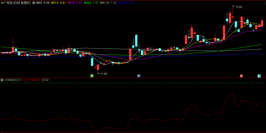 日线图上,CCI1在400以上,且CCI1一直大于CCI2,这是肉最厚、长肉最快的阶段,CCI1死叉CCI2,且CCI1见顶后,肉最快的阶段结束,进入硌牙阶段,骨头比较多了;或者该股已经见顶,你该走了。