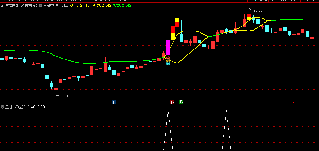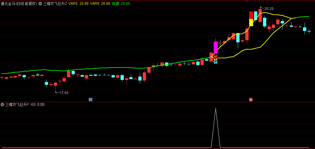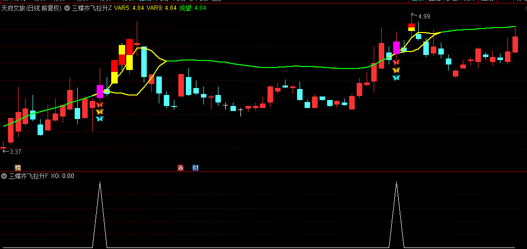 【三蝶齐飞拉升】主图/副图/选股指标,紫色K线伴随蝴蝶图标,是最佳介入点!