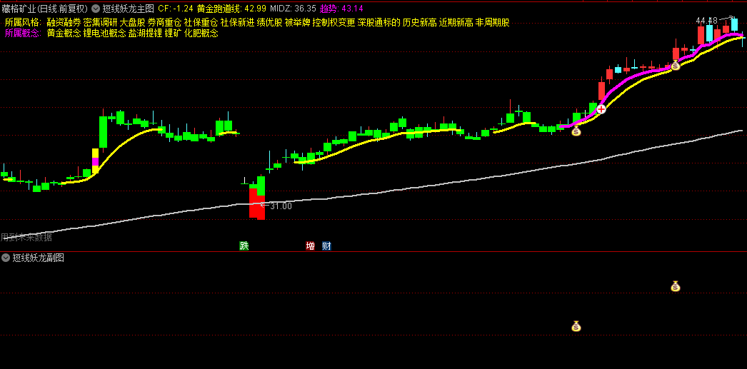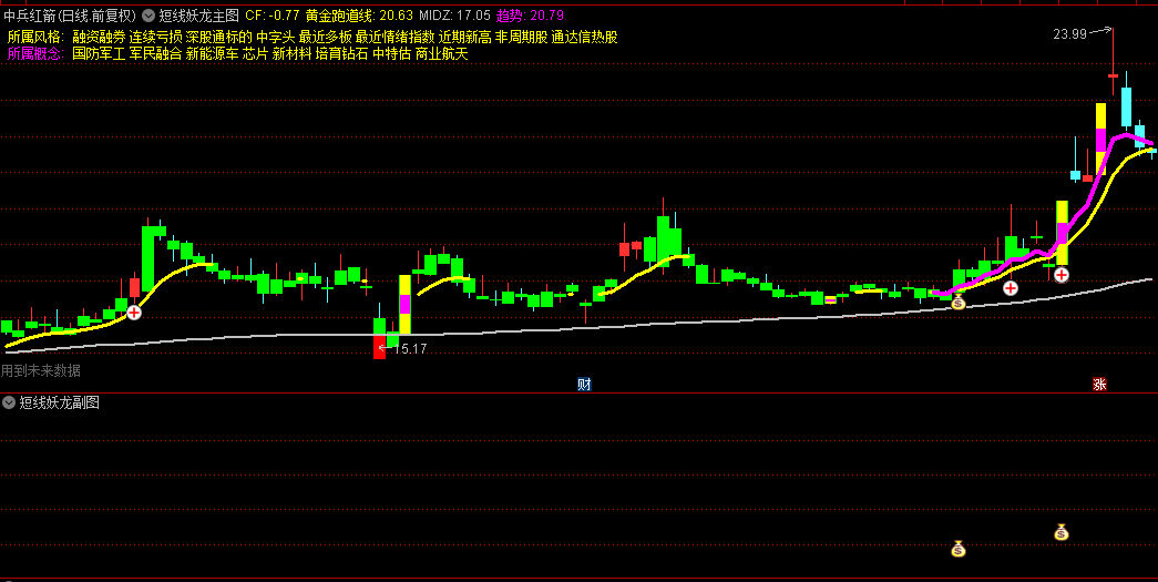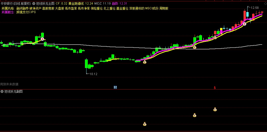 1、主图中“钱袋子”属于两线交叉出的信号,其中的“趋势”洋红色上叉线在趋势的作用下,一旦出现,往往会有大大小小的一波上升行情。
