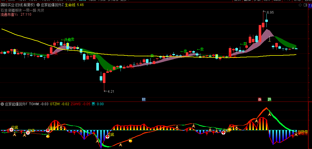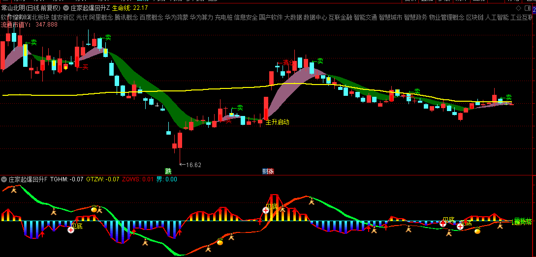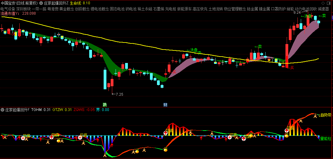 3.洗盘信号:识别庄家洗盘行为,用绿色"←洗盘"文字标注。