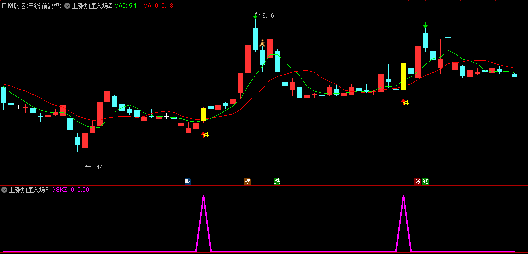 2.买入信号:当出现"进"字提示和黄色箭头时,表示符合买入条件;黄色K线标记符合买入条件的交易日。