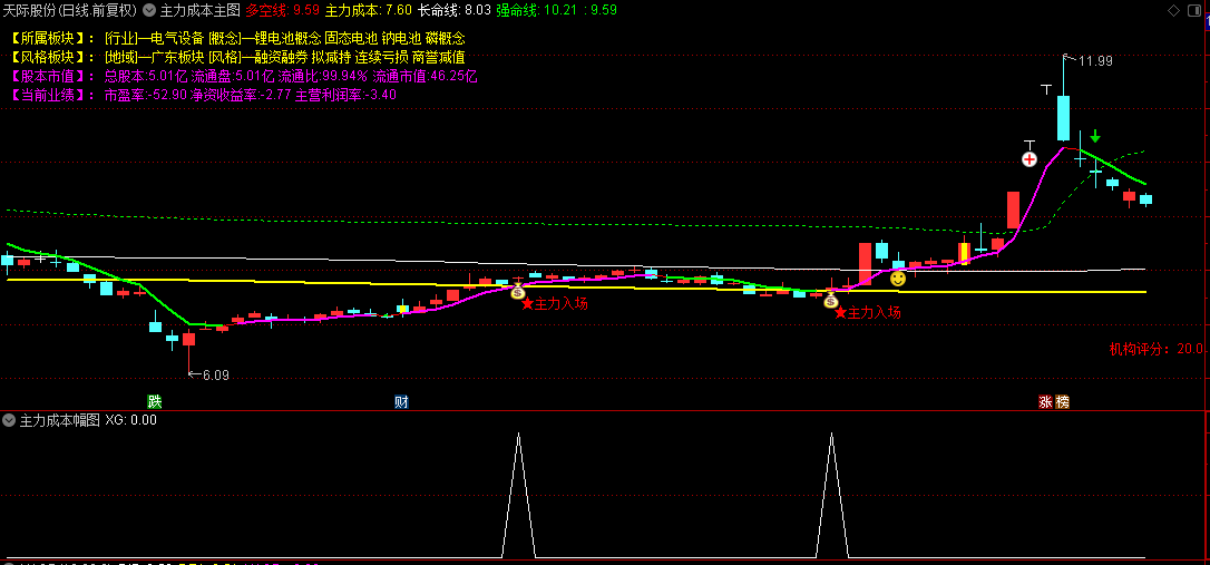 当股价上穿主力成本线时,出现“主力入场--钱袋子”信号;