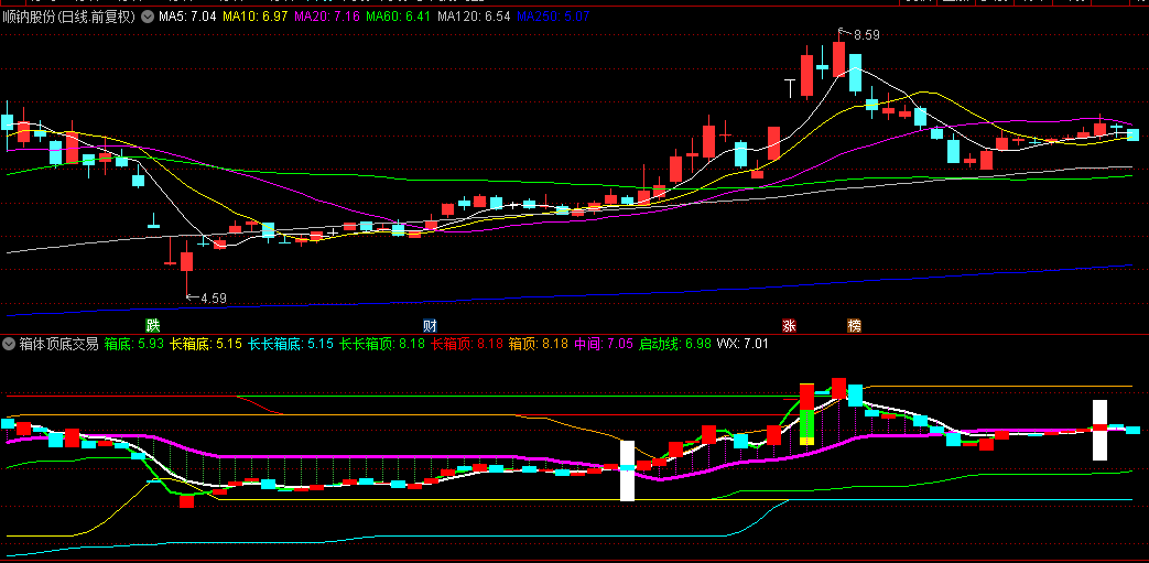 通达信【箱体顶底交易】副图指标,当价格连续突破多个箱体边界时,可能形成趋势行情