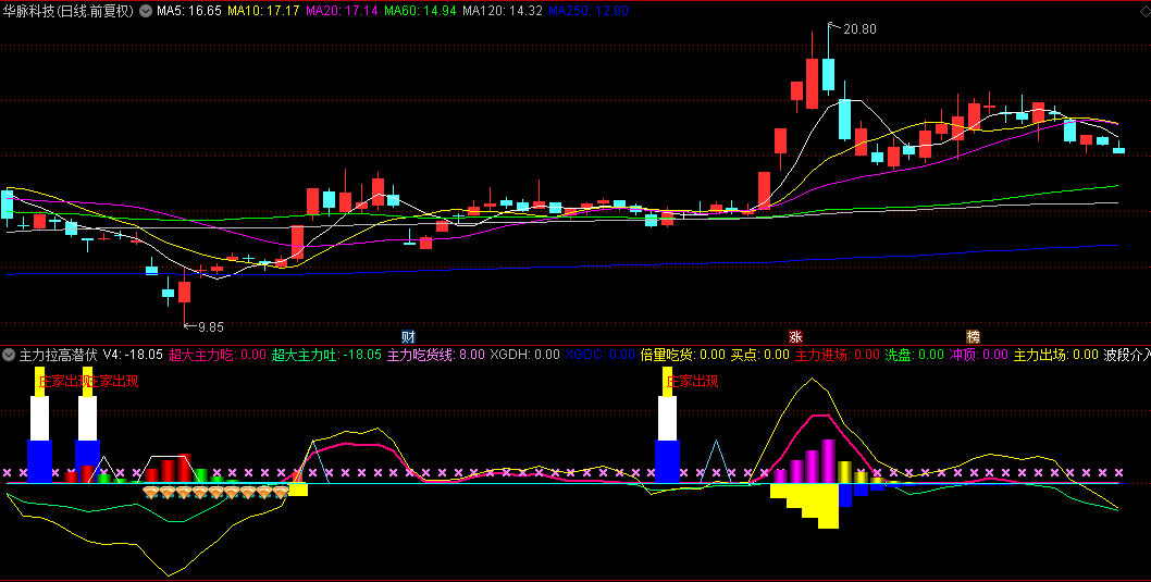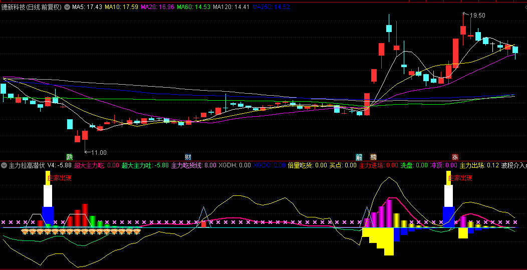 庄家出现:蓝白黄三色柱+红色文字提示,结合KDJ和均线条件;