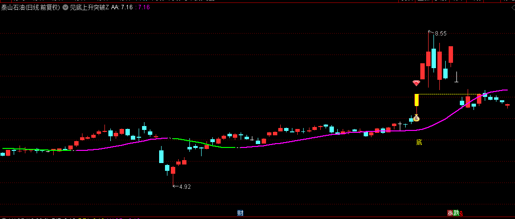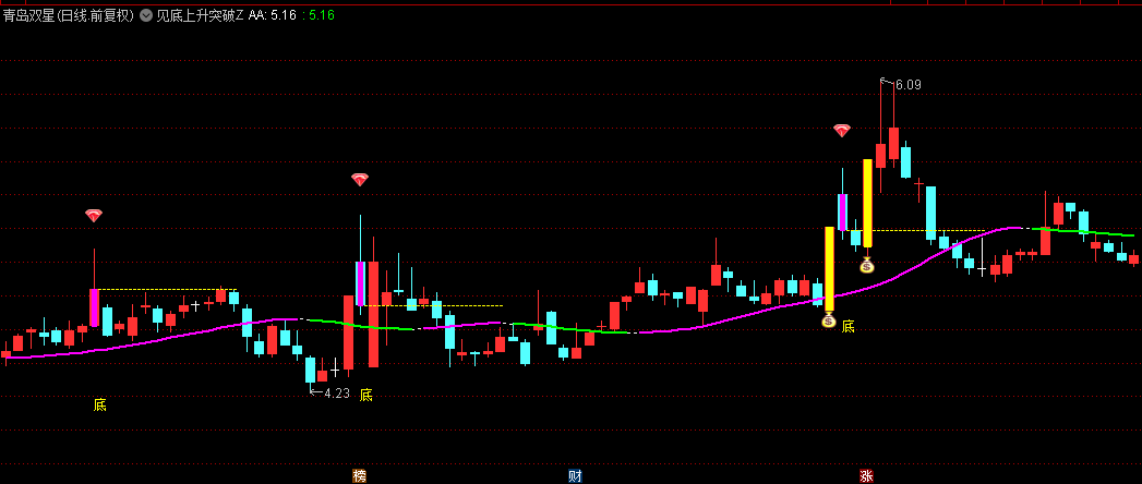 通达信【见底上升突破】主图/副图/选股指标,当符合全部底部特征,标记出现突破信号!