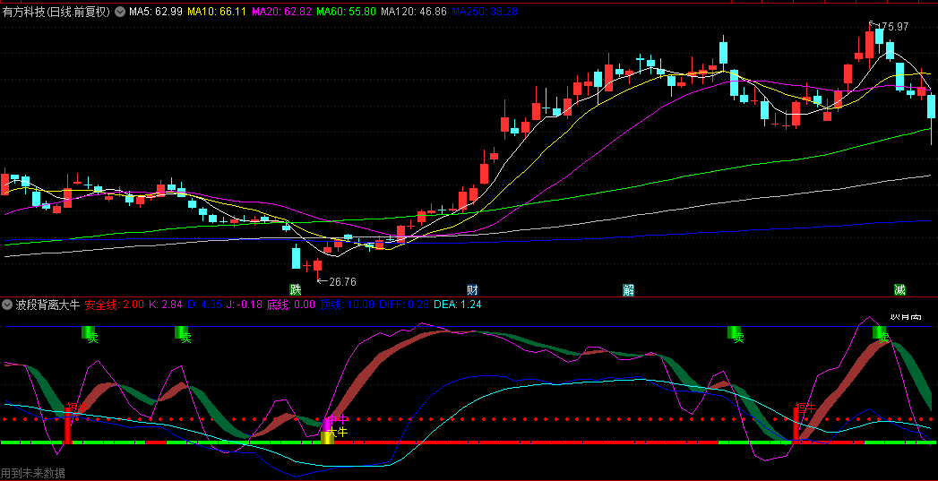 通达信【波段背离大牛】副图指标,自动绘制上升趋势线与下降趋势线,有效捕捉波段起涨点!