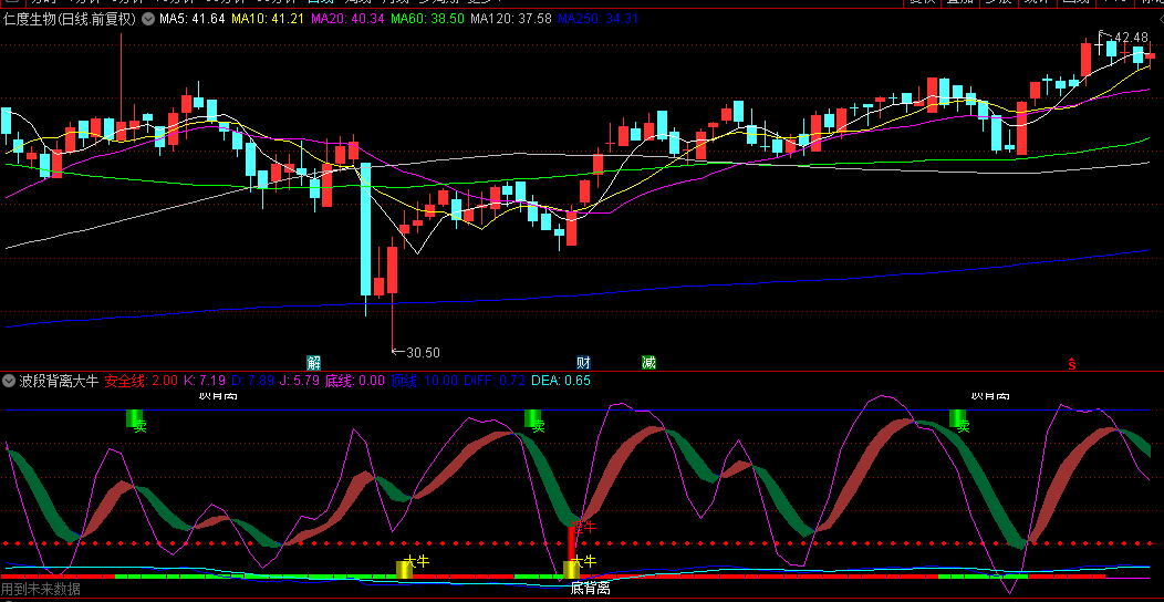 2.中牛信号(粉红柱):股价低于21日高点18%+趋势反转。