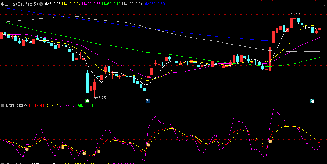 视觉提示:当K值上穿D值且J值曾低于70时触发选股标记。
