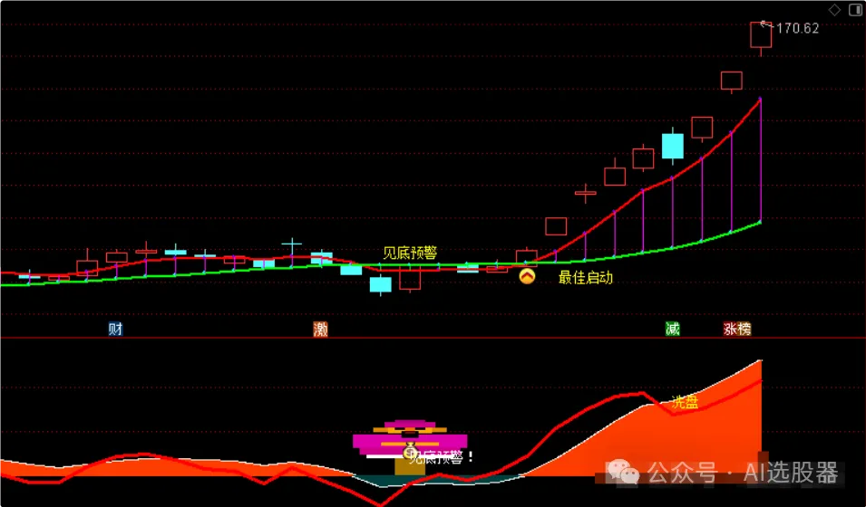 亮点:主图给出“见底预警”“最佳启动”两步提示;副图用动量带颜色区分主力/散户;选股一次筛出共振点。