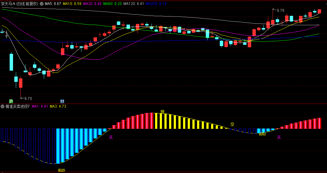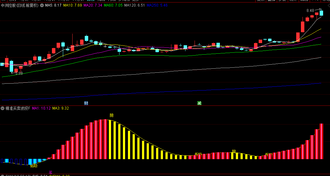 通达信【精准买卖波段】副图/选股指标,柱体颜色变化判断行情强度,结合金叉/死叉把握买卖时机!