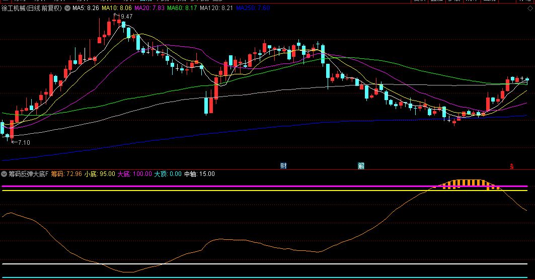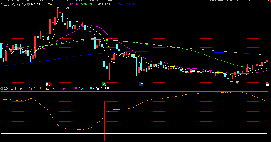 本指标是一款结合趋势跟踪与超跌反弹识别的复合型技术工具,由筹码分布监测系统和多维度底部确认机制构成。该指标不含未来函数,其核心功能模块包含以下三大要素: