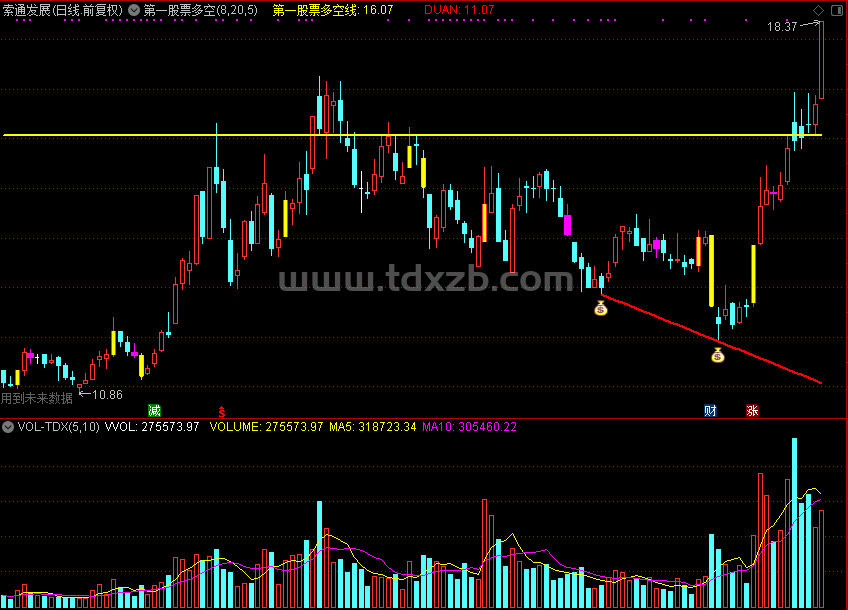 第一股票多空线:IF(QZXM_TODAY >= QZXM_50, QZXM_50, IF(QZXM_TODAY > QZXM_52 AND QZXM_TODAY < QZXM_50, QZXM_54, IF(QZXM_TODAY <= QZXM_52, QZXM_52, DRAWNULL))),COLORYELLOW,LINETHICK2;