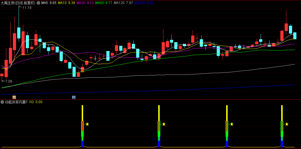 黄色柱体强势动能预警,绿色柱体趋势延续信号,蓝色柱体动能衰减提示,红色柱体反转风险警示,图形标记:"—★"符号精准标注关键转折位。