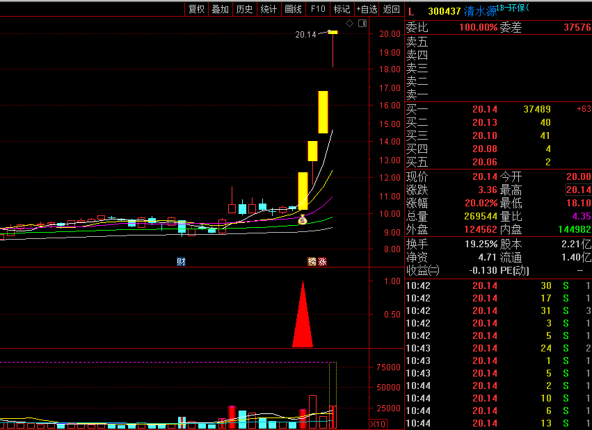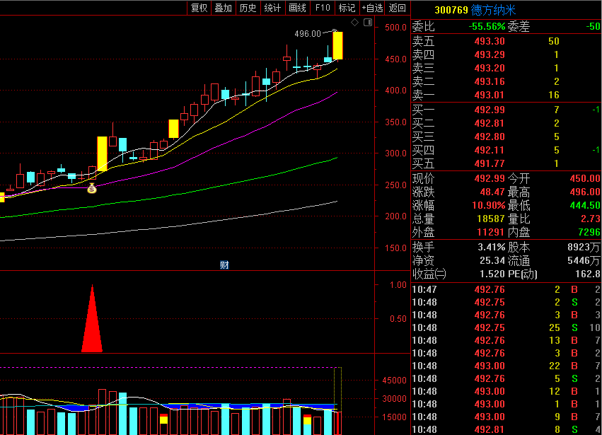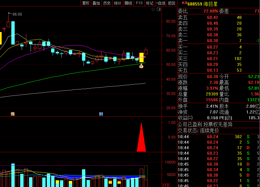 解读:5日均和10日均多头排列,10日均向上出现5日和10日均跨线阳,这根阳线的力度和分时平稳度非常重要,最好能在5-7个点缩量横盘一小时左右,这叫悬停,是又强又稳的表现。