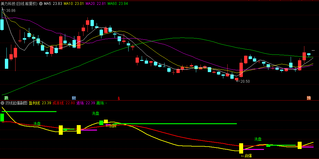 该指标主要用于识别趋势启动点(启爆)、回踩机会(回踩)以及洗盘信号(洗盘),同时提供进场和离场参考线,帮助判断买卖时机。