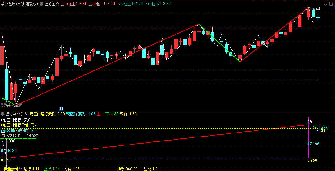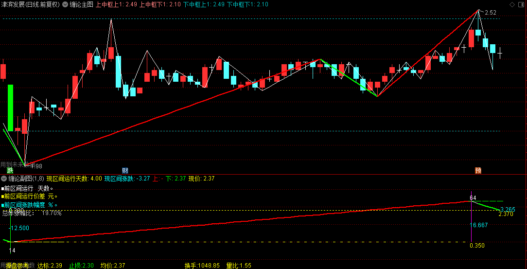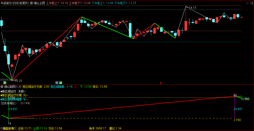 1.中枢识别:自动识别并绘制上涨中枢(红色)和下跌中枢(绿色)。