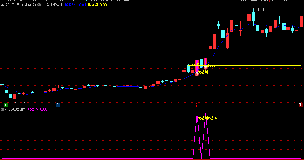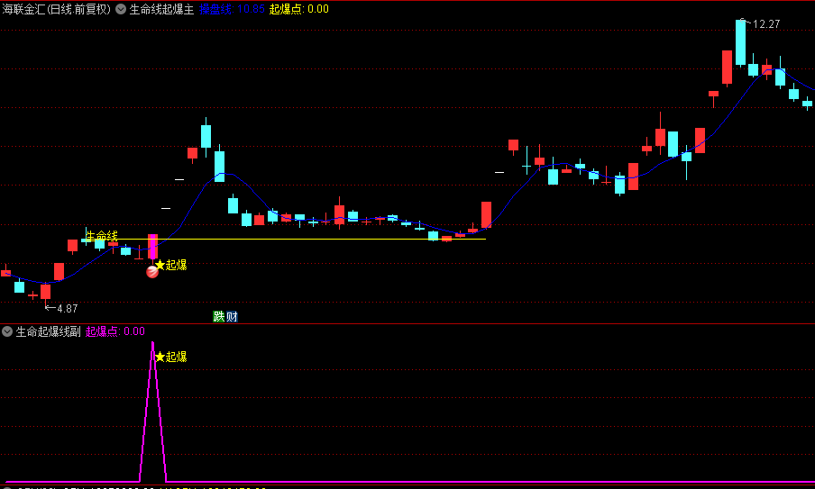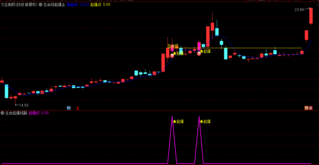 该指标的核心价值在于捕捉主力资金试盘的关键信号:当股价K线有效突破并站稳黄色生命线时,系统将触发"起爆点"买入信号。