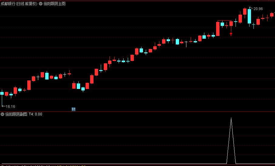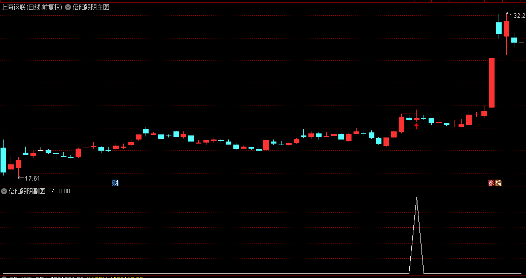 倍量阳线后面跟着一个阴线,必须是孕线的阴线,也就是说,阴线被前面阳线实体包围,上下影线可以不被包围,主图显示的红色箭头是突破倍阳高点的信号,是买点信号,红色水平实线是前高画线,主图显示比较简单,看得很清楚,可以做个盘中预警,经常抓到创业板的首板,预警出现可以结合其他指标综合分析,这个思路最近出票比较多,可以多关注。该指标不含未来函数!