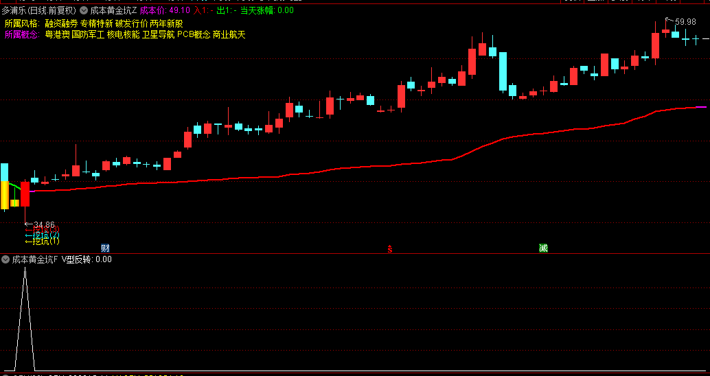 1.成本透视功能采用95%成本带宽算法,实时绘制紫色动态成本线,红绿变色提示成本趋势转折。